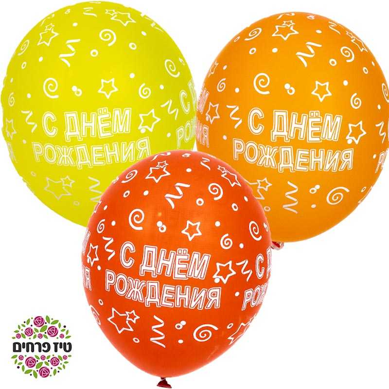 בלון יום הולדת שמח ברוסית עם הכיתוב “С Днем рожденья” בצבעים אדום כתום וצהוב.