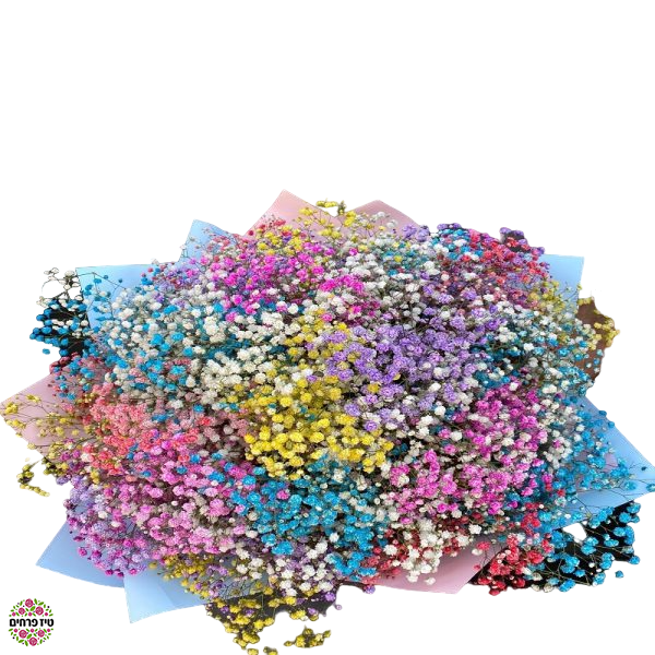 זר פרחים המורכב מגיפסניות צבועות ארוז בנייר מהודר השלל צבעים