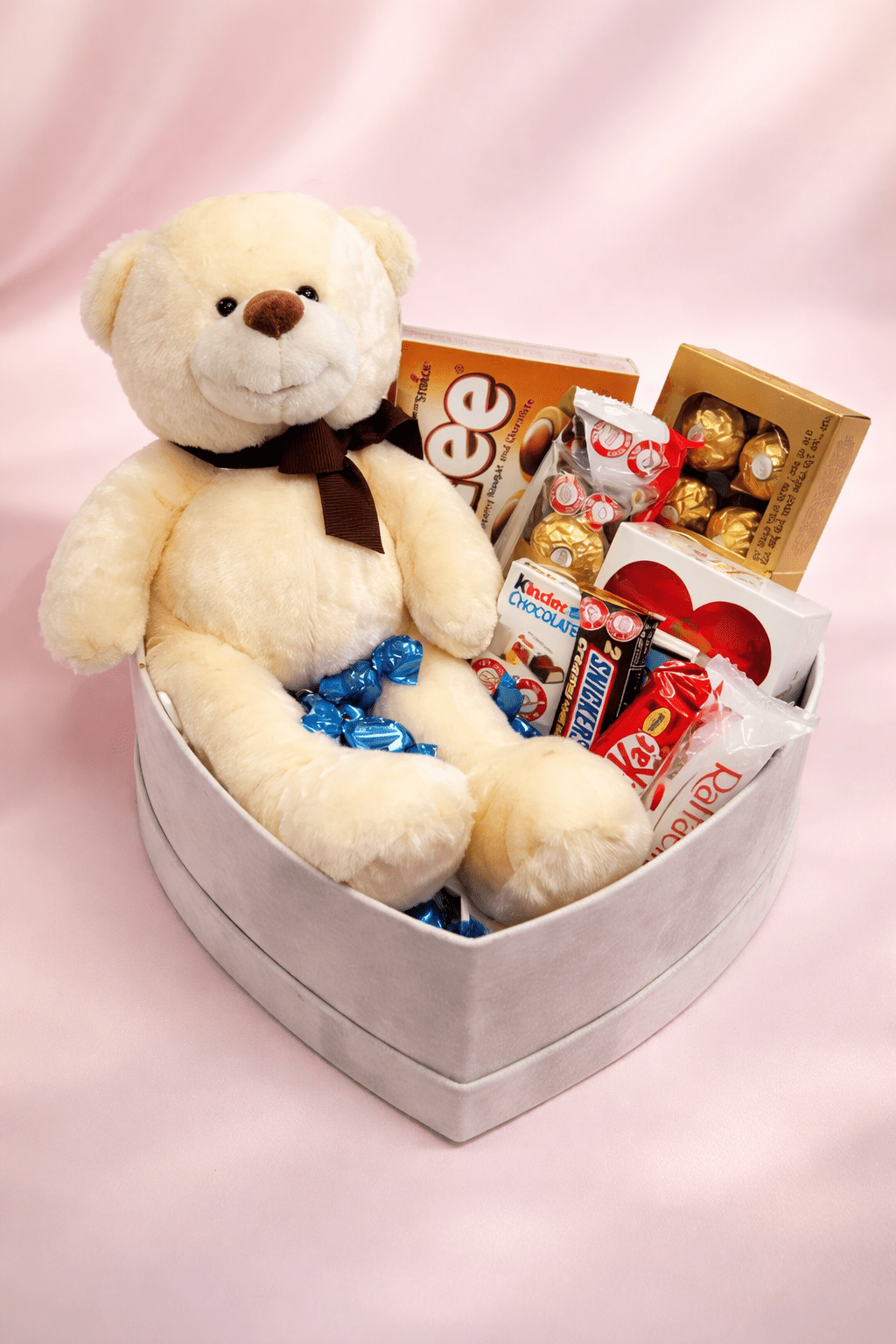 מארז לבבי ואוהב המכיל דובון ומגוון שוקולדים.