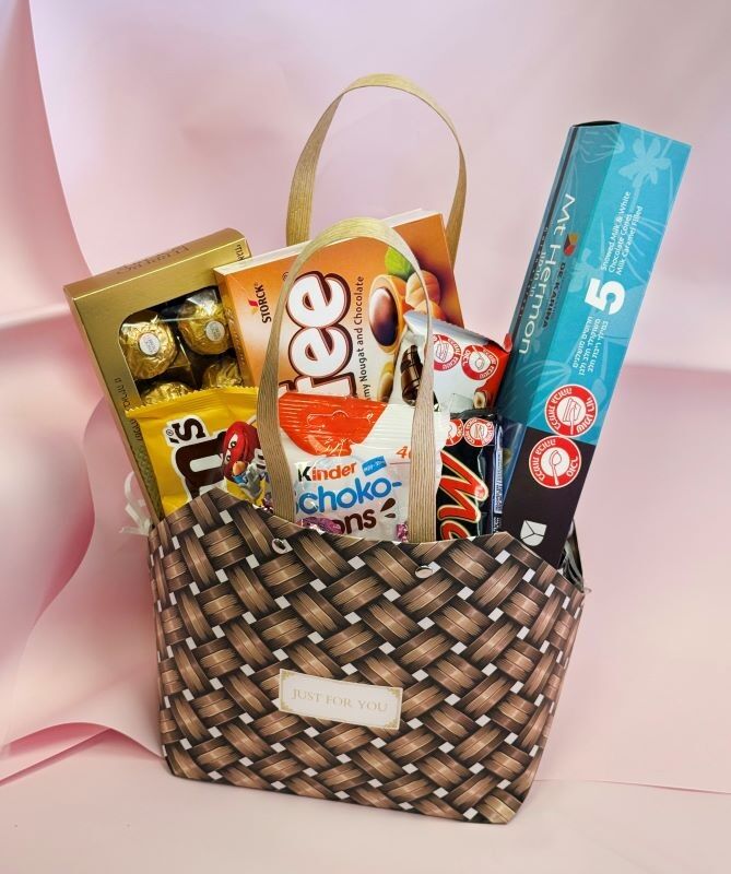 מארז השופע במגוון שוקולדים ומתוקים.