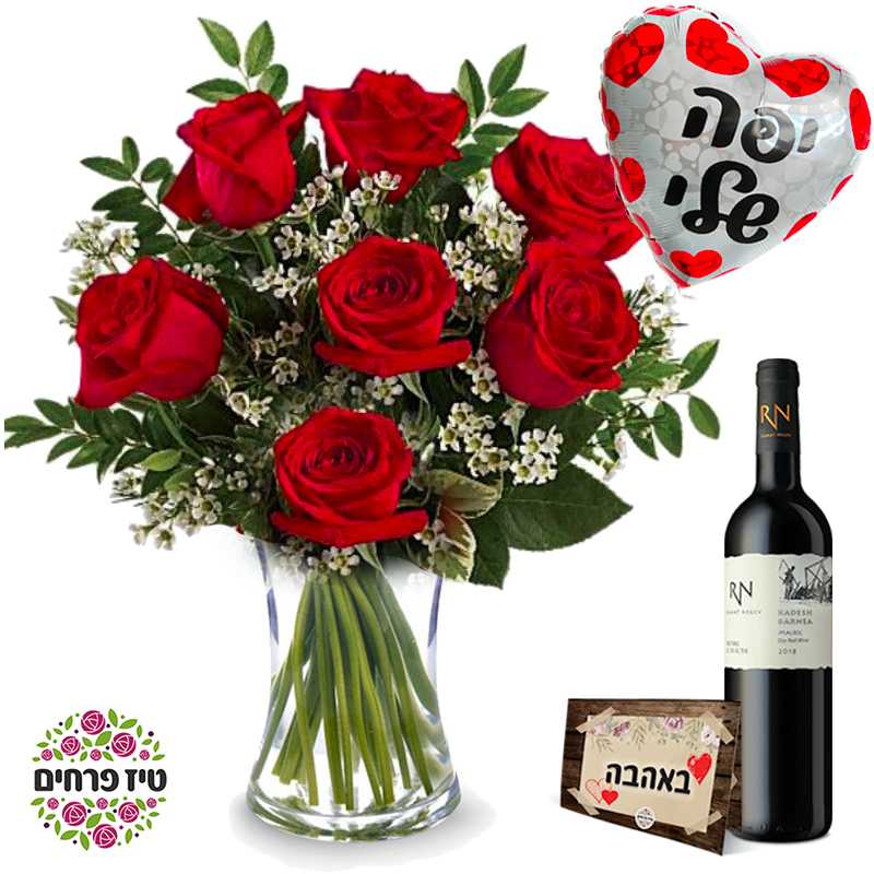 זר ורדים קלאסי ועוצמתי השזור מ-7 ורדים (ראש גדול), גיבסנית וירק ב149ש”ח.