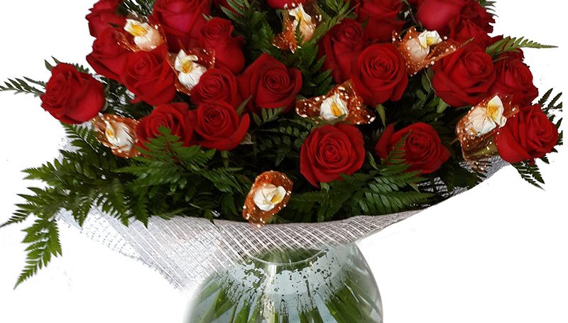 זר פרחים המורכב מורדים אדומים ופרלינים (שוקולד) איכותיים.